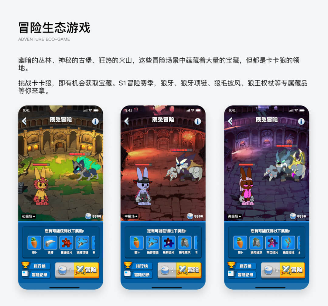 如图所示购买辰卡获得辰兔参与种植萝卜,辰兔有7种不同稀有度,辰兔可升级、组成羁绊、繁殖、合成等方式提高产出,萝卜在兔工厂加工成罐头以另外一种方式参与藏品,用户可以在兑换商城用萝卜/罐头兑换实物。