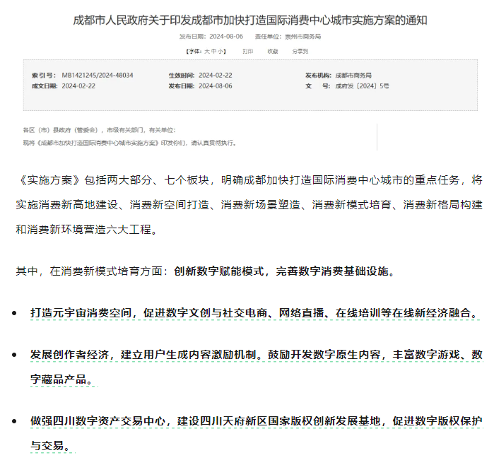 数字藏品作为打开元宇宙的重要大门,也是近些年各地高度重视的创新项目。昨天,成都发布了《加快打造国际消费中心城市实施方案》,方案中明确了打造元宇宙消费空间,促进数字文创与社交电商、网络直播、在线培训等在线新经济融合。